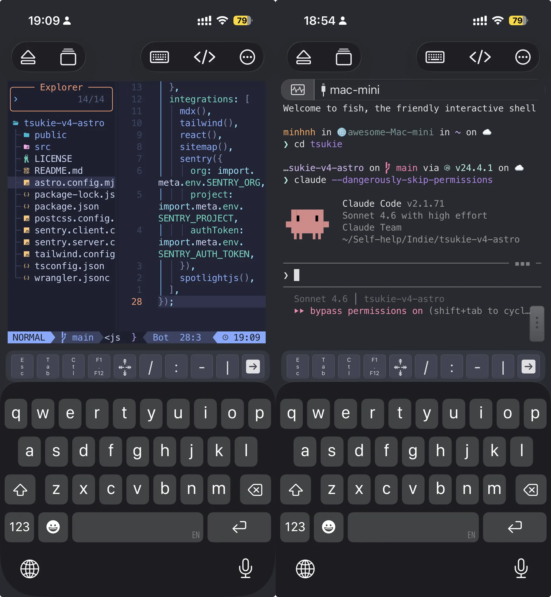 The dev server runs natively on your Mac Mini. You’re not running anything heavy on the phone. The phone is just a terminal + browser combo pointing at the real machine.